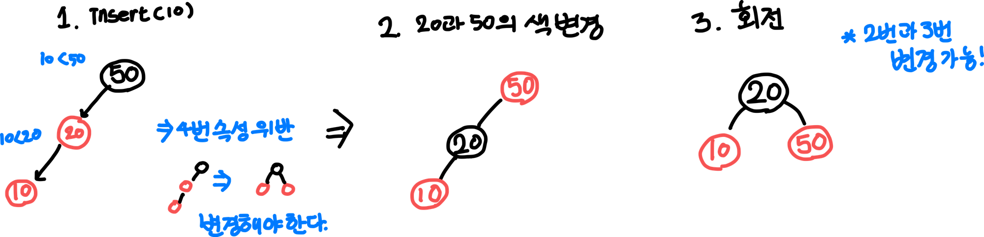 - 루트 노드는 Black이여야 함으로 Black으로 변경